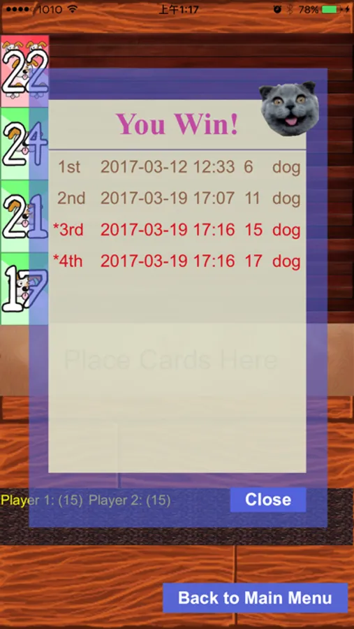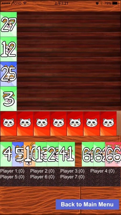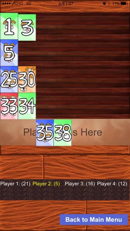 Player with 10 cards initially to put on 4 rows, one card each time. The row to put depends on the value of the card, which must be larger than the largest card on the row. When the put position exceeds a certain threshold, that player need to accept all the cards on that row. In case the card value is smaller than any of the cards in the 4 rows, player need to decide which to row to put and accept the cards. Each card has different number of "dogs" value. The one with minimum total number of "dogs" value will be the winner. Please refer to https://youtu.be/MqlA83nQ4Og for detail instruction.
