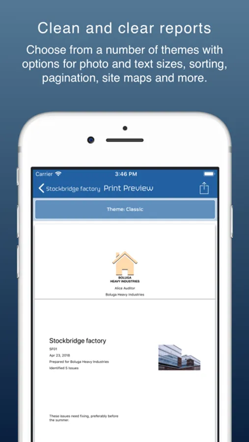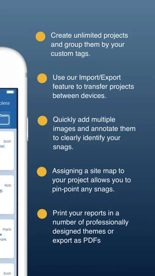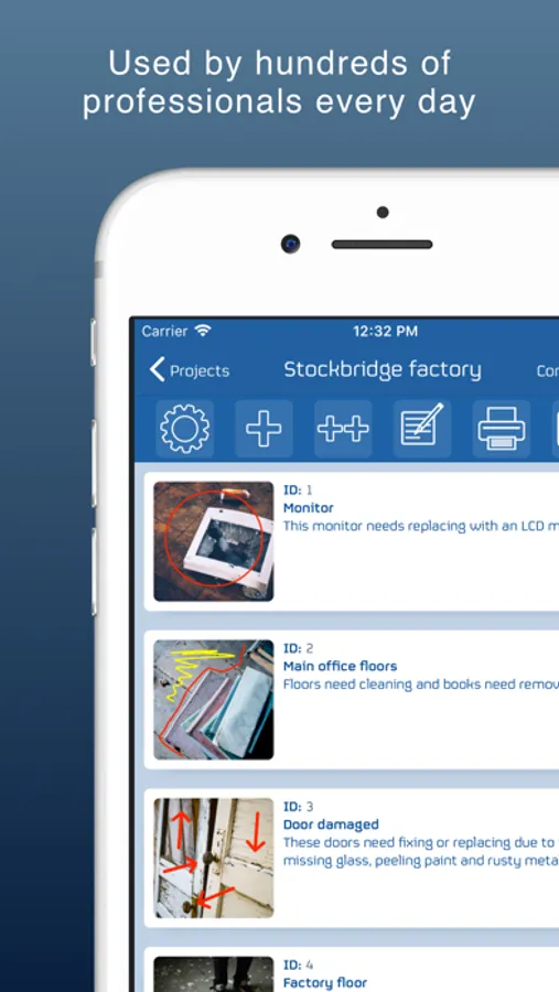 Record, photograph and annotate issues directly on your device. With an in-app purchase you can unlock the option to print or share a full report via PDF.