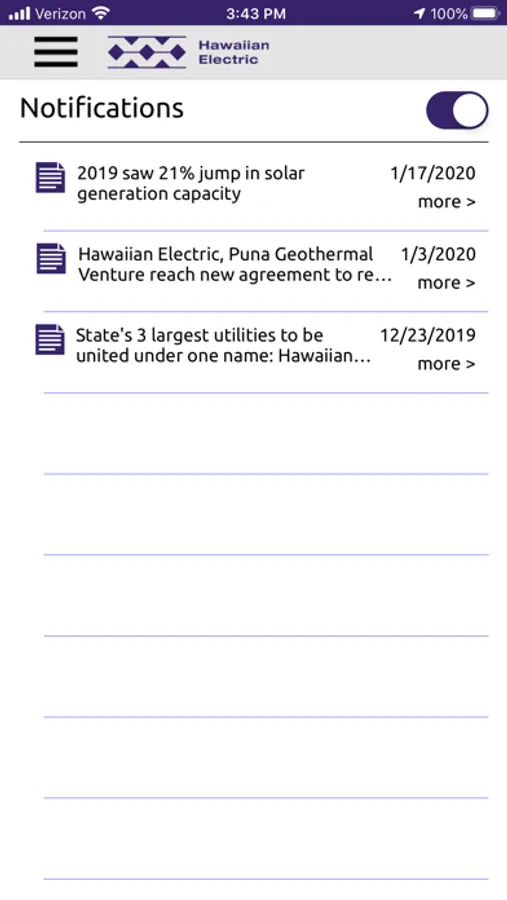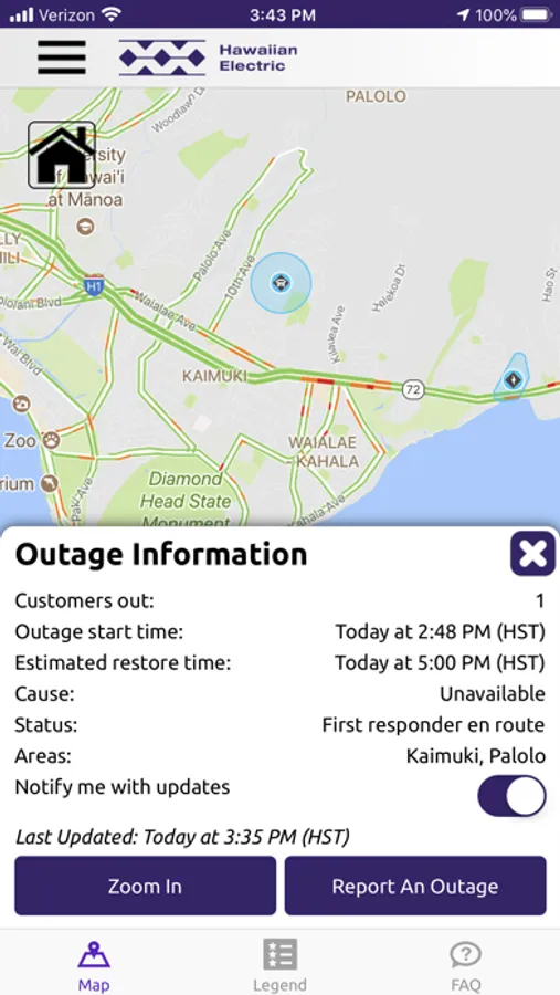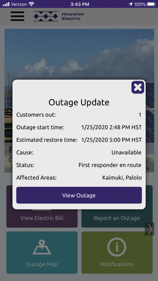 The Hawaiian Electric or HECO mobile application is a great way to view information on known outages for the islands of Oahu, Maui, Hawaii, Lanai, and Molokai. Get up-to-date outage information, such as areas impacted; number of customers affected; and estimated restoration time. Receive important information from Hawaiian Electric with our alert and news notification service. Be advised of outages near your current location, using the geolocation feature on your mobile device and sign up for alerts on a specific outage. You can also report an outage directly or get access to the county-specific trouble lines from the mobile application.