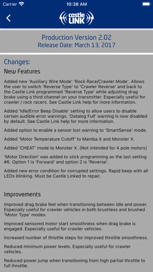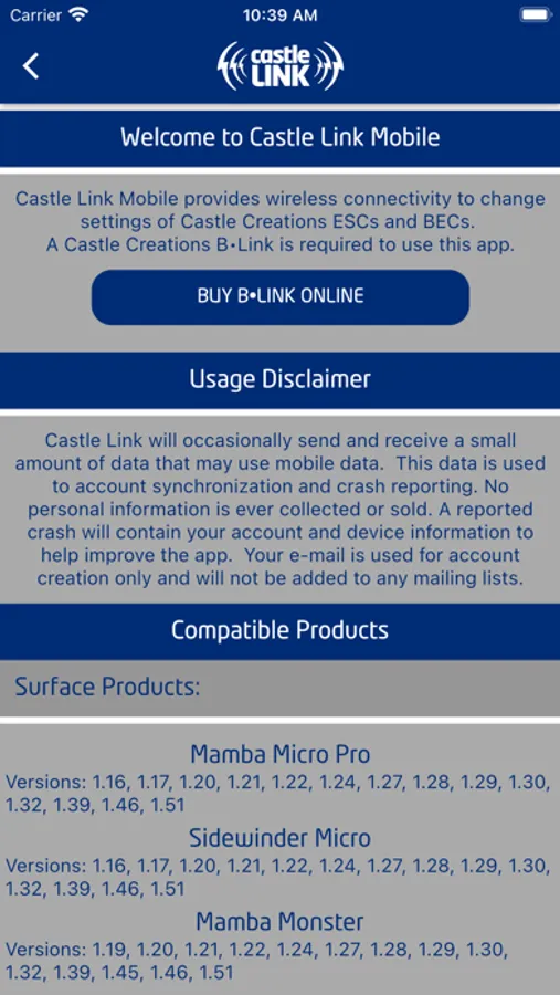 The Castle Link™ app enables users to wirelessly program settings and update firmware on any current Castle Creations ESC, many older models and the BEC 2.0/BEC Pro using the waterproof Castle B•LINK Bluetooth® adapter. You can quickly alter parameters and fine-tune adjustments anytime, anywhere.