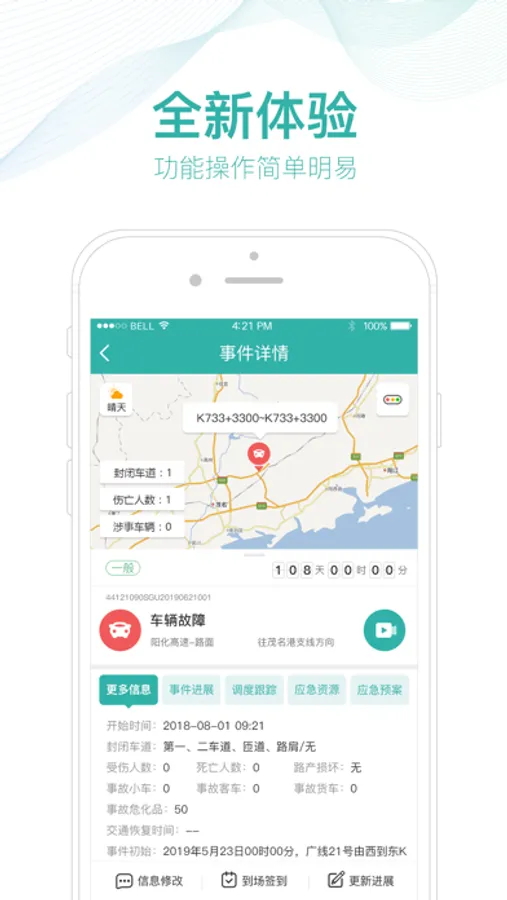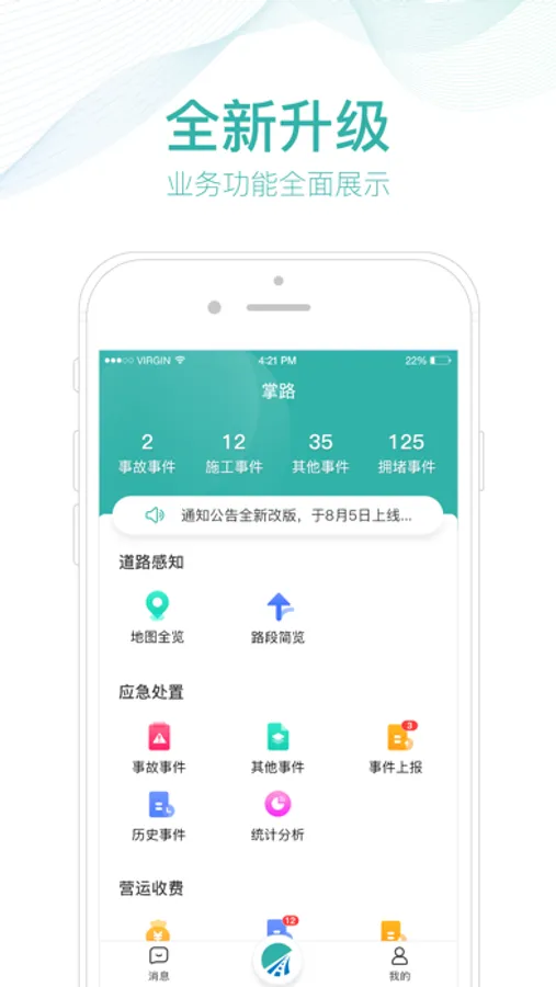 掌路APP是我司针对高速公路监控综合业务,应用最新的互联网+技术及大数据应用研发的一款智能手机APP软件,实现在手机APP上查看高速公路实时路况,摄像枪、情报板、监测设备的数据,各种交通事故、施工事件的信息等,以图形化的方式直观展示出来,使用户与监控中心保持同步,随时随地,查看路况。