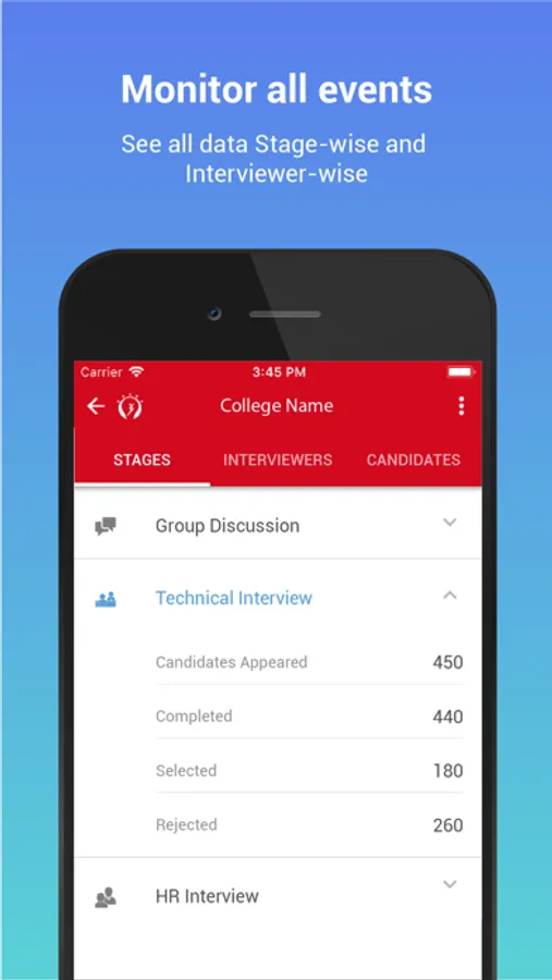 - Ease of monitoring the ongoing event: stage wise or interviewer wise.