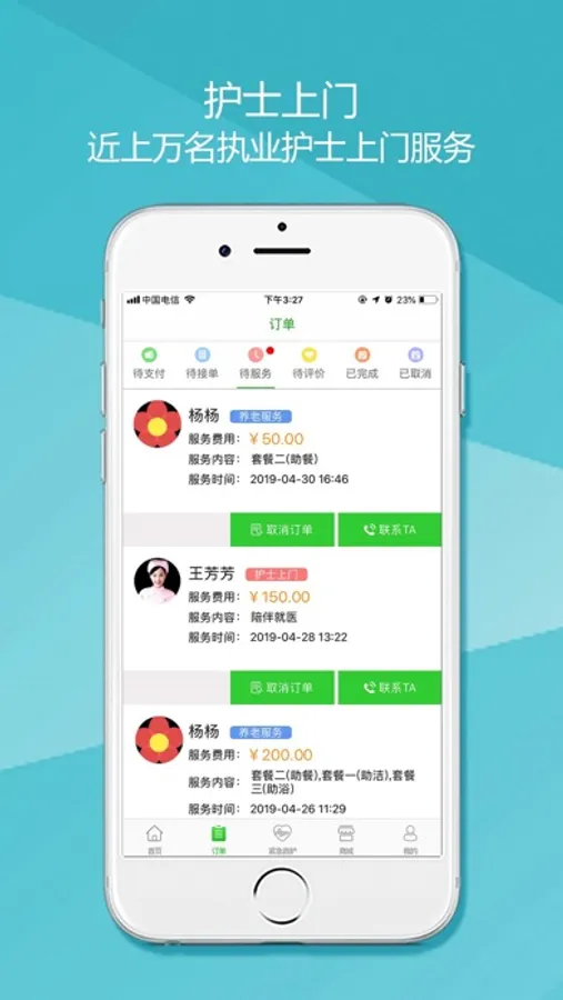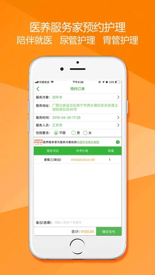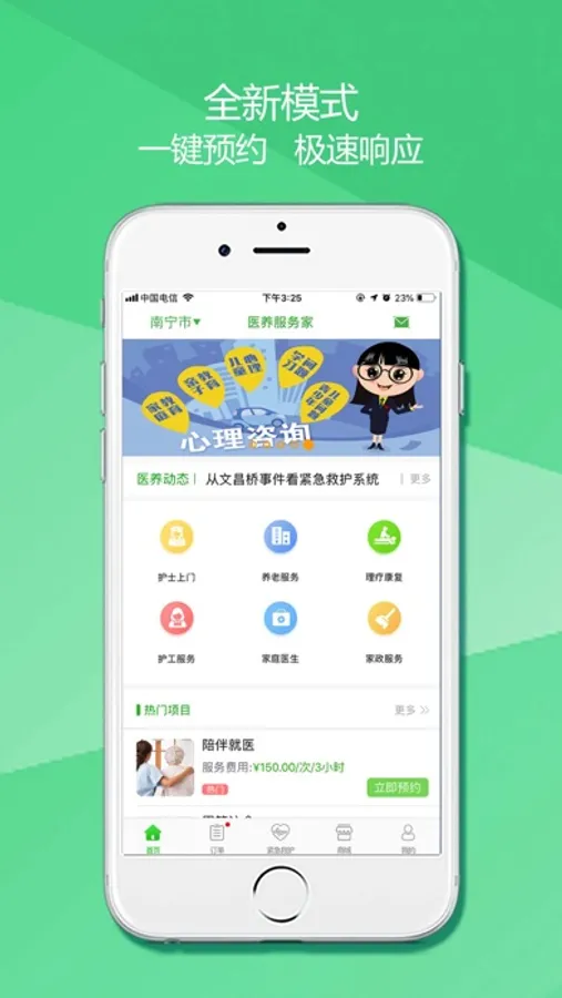 南宁医养服务家投资有限公司成立于2016年7月,顺应国家老龄化社会的大背景,专注于养老服务。公司致力开发的核心产品——医养服务家App,是我国首个专注养老护理服务及家政护理服务一体的O2O平台。平台运用互联网+护理+养老+家政的模式,实现供需双方线上发布、在线撮合预约、在线订单形成、线下服务、在线支付、在线评价等功能。App主要分成三大模块:找护理、找家政、紧急呼叫。找护理模块提供医院陪诊、上门护理(居家陪护、疼痛护理、伤口护理、管道护理、中医理疗、临终关怀)等数十项专业护理服务。找家模块提供月嫂、保姆、医院陪护、上门维修、代办事物、上门洗头、上门保洁等服务。紧急呼叫模块为有紧急医疗救助的人提供呼叫就近医护人员现场施救的服务。用户根据自身需求可实现在线下单,即时发布,迅速调动周边医护人员、家政服务人员资源上门或到现场提供及时服务。
