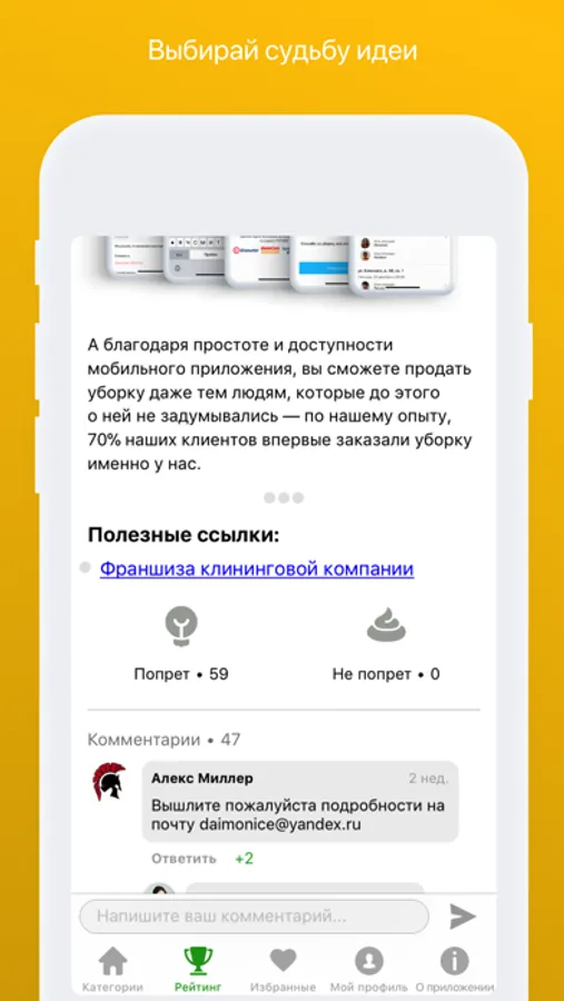 Бизнес идеи, за которые можно голосовать! Пожалуй лучший каталог идей для малого бизнеса в России. Привлекательность идеи можно оценить с помощью кнопок попрет/не попрет.