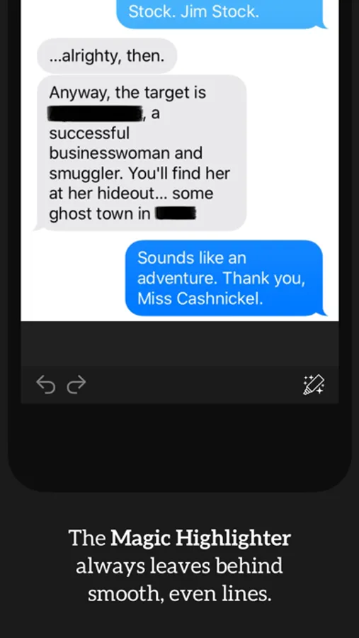 Using the Magic Highlighter, get beautiful, even, complete hiding of text in screenshots and photos. Or switch the magic off to censor anything behind your own scribbles.