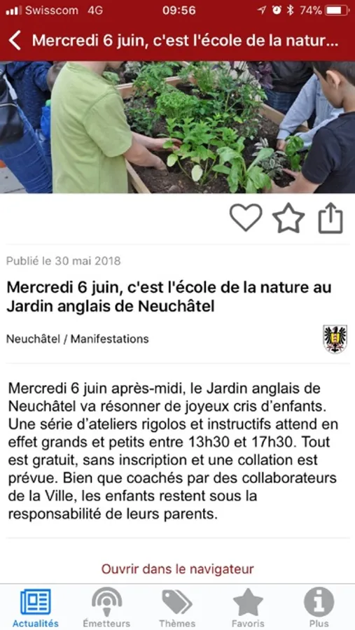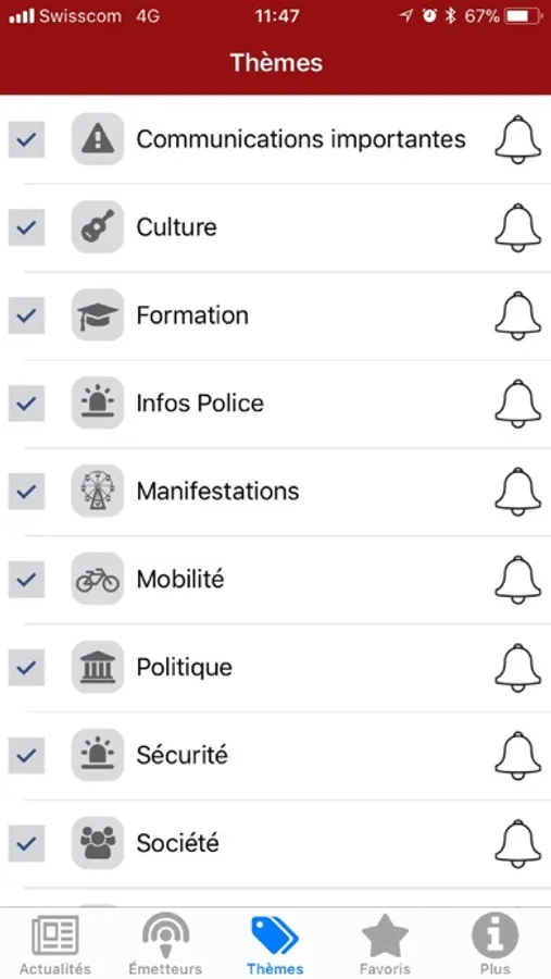 GESTION DES ACTUALITÉS Vous pouvez composer vous-même votre fil d’actualité en sélectionnant les sources d’information que vous souhaitez (canton, communes, etc.) et les thèmes désirés dans la liste suivante : culture, formation, manifestations, mobilité, politique, sécurité, société, sports, vie pratique. Par défaut, toutes les sources (« émetteurs » et tous les thèmes sont activés. Il est possible de les désactiver en tout temps. Emetteurs et thèmes non souhaités n’apparaîtront alors plus dans le fil d’actualité. Vous pouvez également désigner vos actualités les plus appréciées, consulter les publications les plus lues et constituer votre liste d’actualités favorites. Les informations publiées sur NEMO News peuvent être partagées sur les principaux réseaux sociaux.