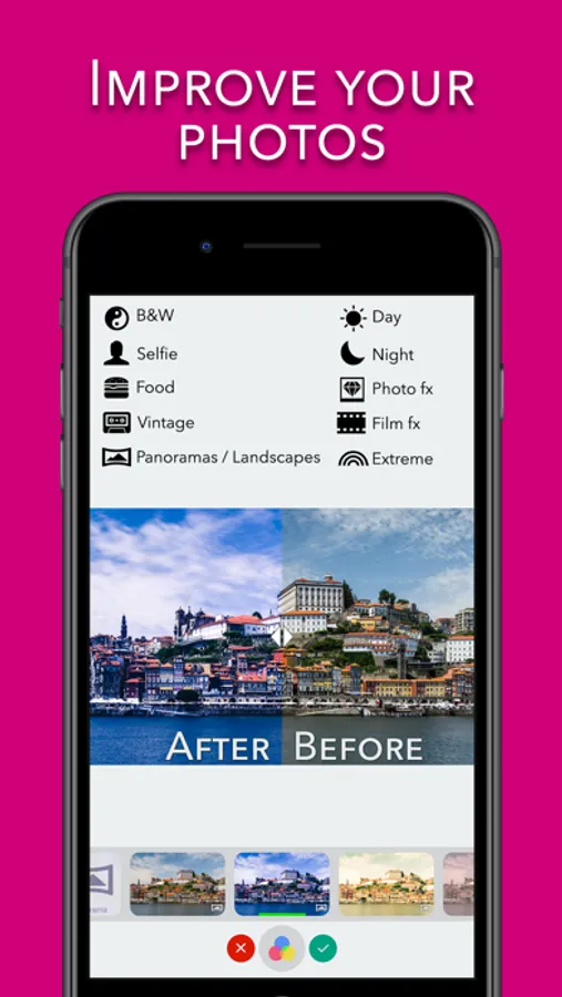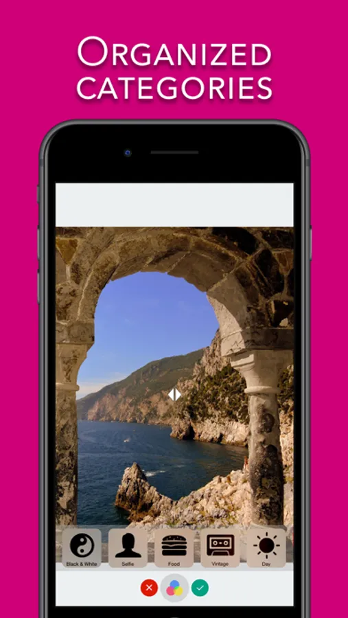 Black & White, Selfie, Food, Vintage, Panoramas / Landscapes, Day, Night, Photo fx, Film fx