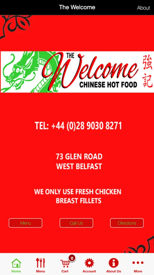 The Award winning 'Welcome Chinese' Browse their menu from starters to desserts and see what tickles your taste buds. Located on the Glen Road, West Belfast, you can choose to collect your order at a time that suits you in advance for delivery or if you prefer to collect. Don’t forget to let us know if you enjoyed your meal and Bon appetite!