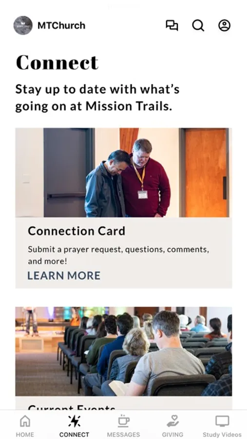 Welcome to the Mission Trails Church app. We look forward to connecting with you. Inside the app you will find opportunities to connect with our community, see events, listen to sermons, access our mobile giving, take notes and enjoy a built in Bible. Please do not hesitate to reach out to us for ideas on how we can continue to serve.
