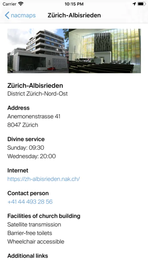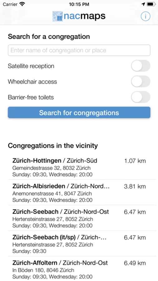 nacmaps is an app that offers convenient access to addresses and contact information of New Apostolic congregations around the world. The app makes it easy to find New Apostolic congregations in the immediate vicinity as well as congregations in certain cities and countries. The congregations are displayed in list or map views. After selecting a congregation, the congregational website can be accessed, the contact person called, or directions started via installed navigation apps. nacmaps is ad-free and free of charge.