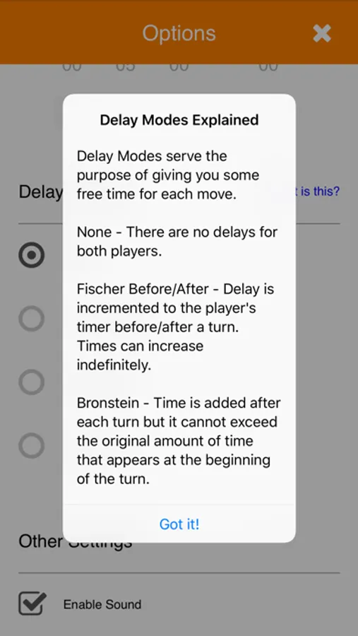 - Fischer Before/After: Delay is incremented to the player's timer before/after a turn. Times can increase indefinitely