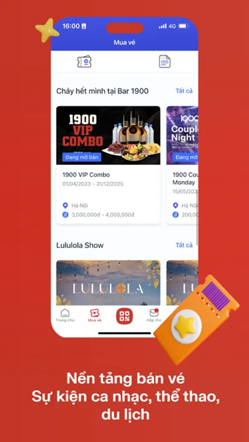 + Mua vé xem thể thao, giải trí, âm nhạc, sự kiện