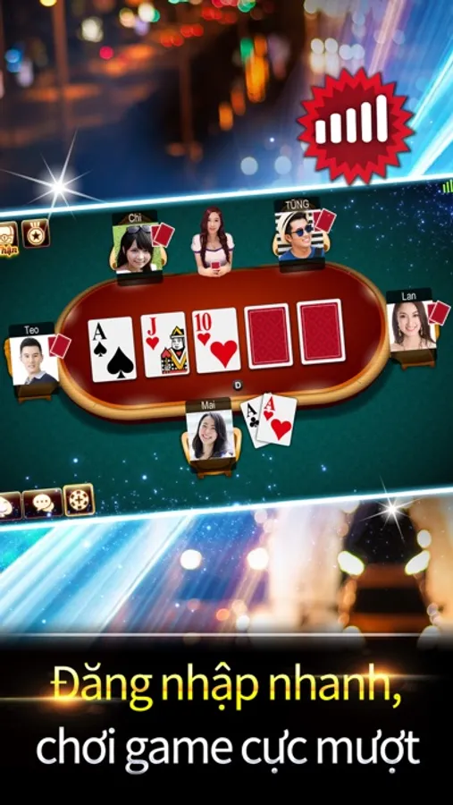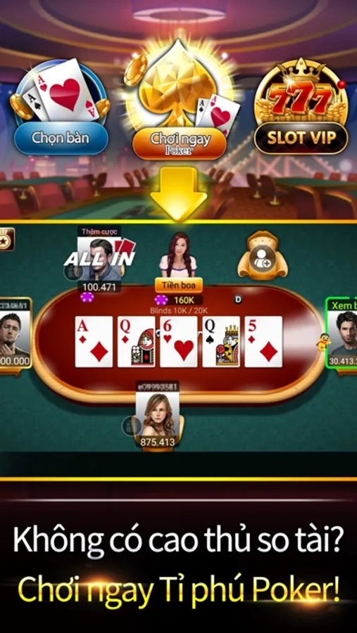 Vào bàn chỉ với 3 giây, online chơi liền tay! Texas Hold’em chính thống đã có mặt tại Việt Nam. Không cần đăng nhập, chơi ngay tức khắc! Chơi game vui, All-in mọi nơi!