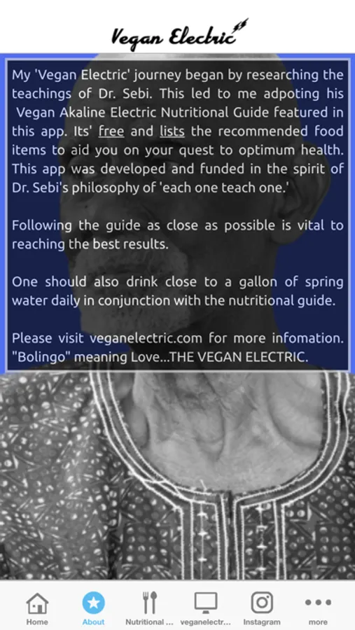 The Vegan Akaline Electric Nutritional Guide featured in this app is based on the teachings of Dr. Sebi. Its' free and lists the recommended food items to aid you on your quest to optimum health. This app was developed and funded in the spirit of Dr. Sebi's philosophy of 'each one teach one.'