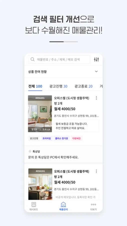 세분화 된 검색 필터로 매물을 보다 효율적으로 관리할 수 있습니다.