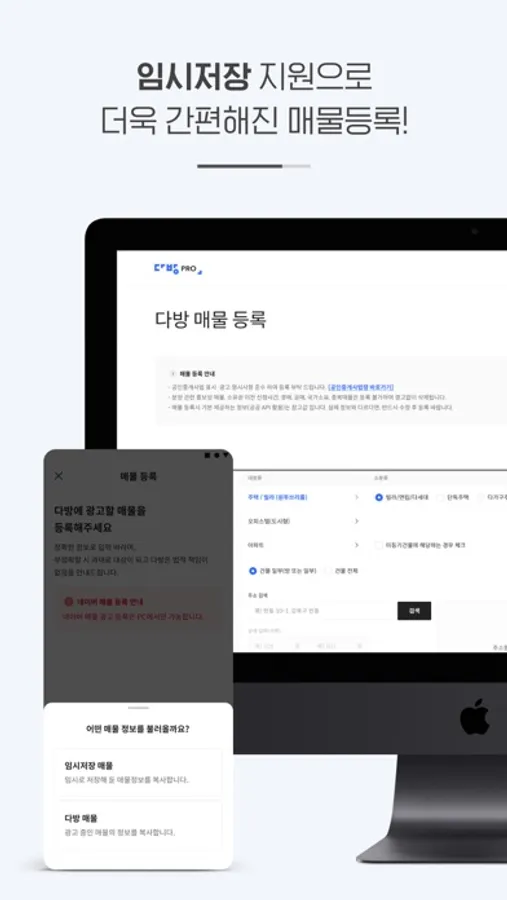 신규 매물 등록 시 임시저장을 지원합니다. 기기·시간·장소에 구애받지 않고 더욱 간편하게 매물을 등록해보세요!