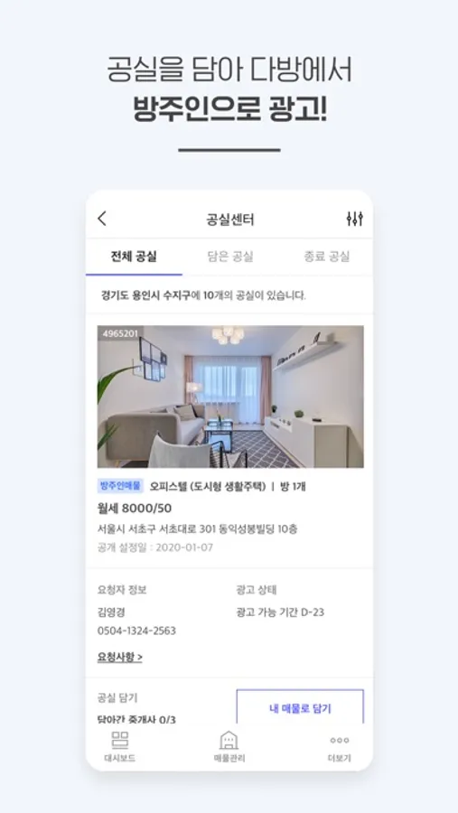 다방허브를 통해 방주인이 중개 요청을 해올 수 있습니다. 중개 요청이 들어온 공실은 담기 수에 제한이 없으며, 다방에서 방주인 매물로 노출됩니다.
