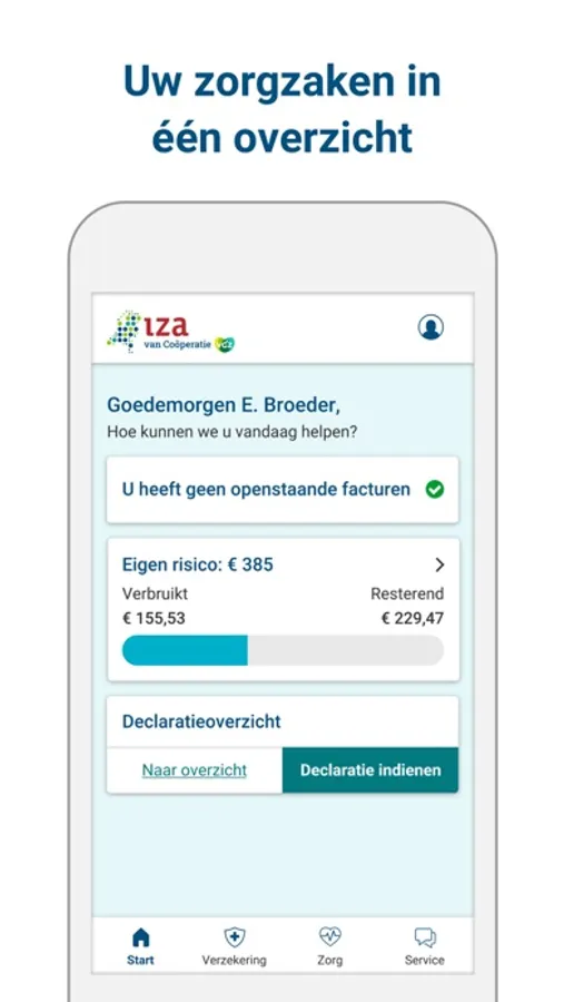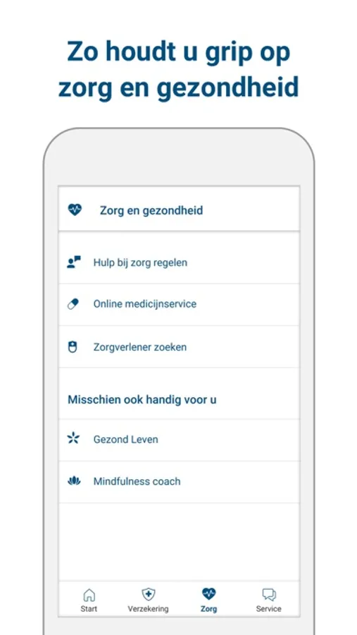 Gezonder leven is niet altijd makkelijk. Daarom helpen we u graag met handige services rondom gezondheid. En heeft u toch zorg nodig? Dan kunt u via onze app snel en gemakkelijk uw zorgzaken regelen. Voor uzelf of voor anderen op uw polis.