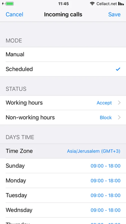 • Incoming calls scheduling module allows divert incoming calls to VM, FW number or DND mode, base on working hours