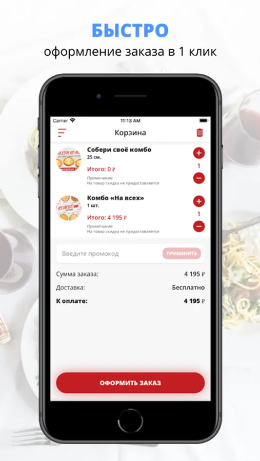 Чтобы оформить заказ, достаточно выбрать любимые блюда из нашего меню, положить их в корзину и отправить заказ онлайн в пару кликов.