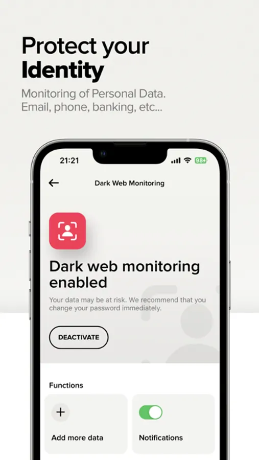 • Dark web surveillance: Deep fakes, online fraud and advertising abuse are consequences of freely accessible data on the Internet. Dark web surveillance protects your identity and searches for your sensitive personal information on the Internet.