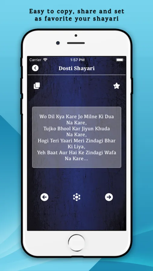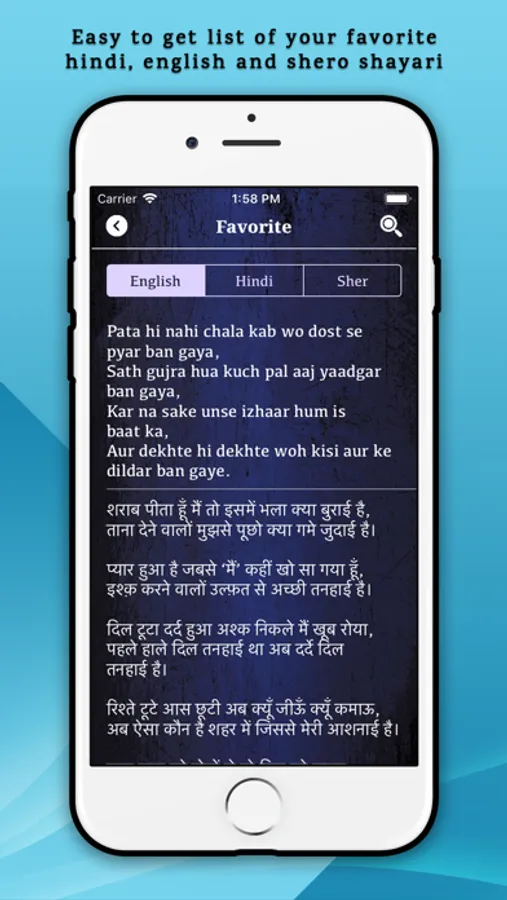 - Favorite features to set shayari as your favorite and get list of all your favorite shayari on one tap.