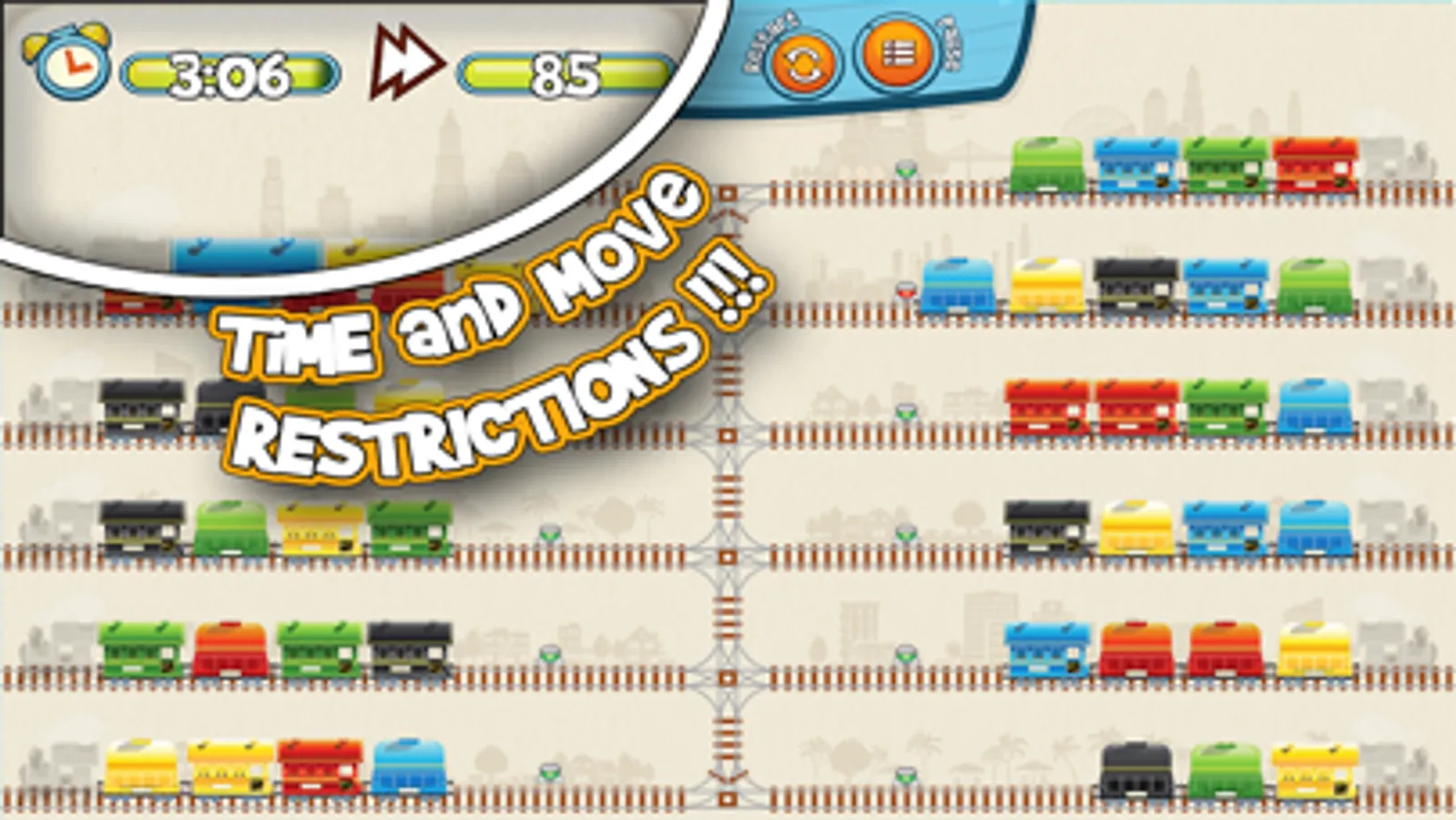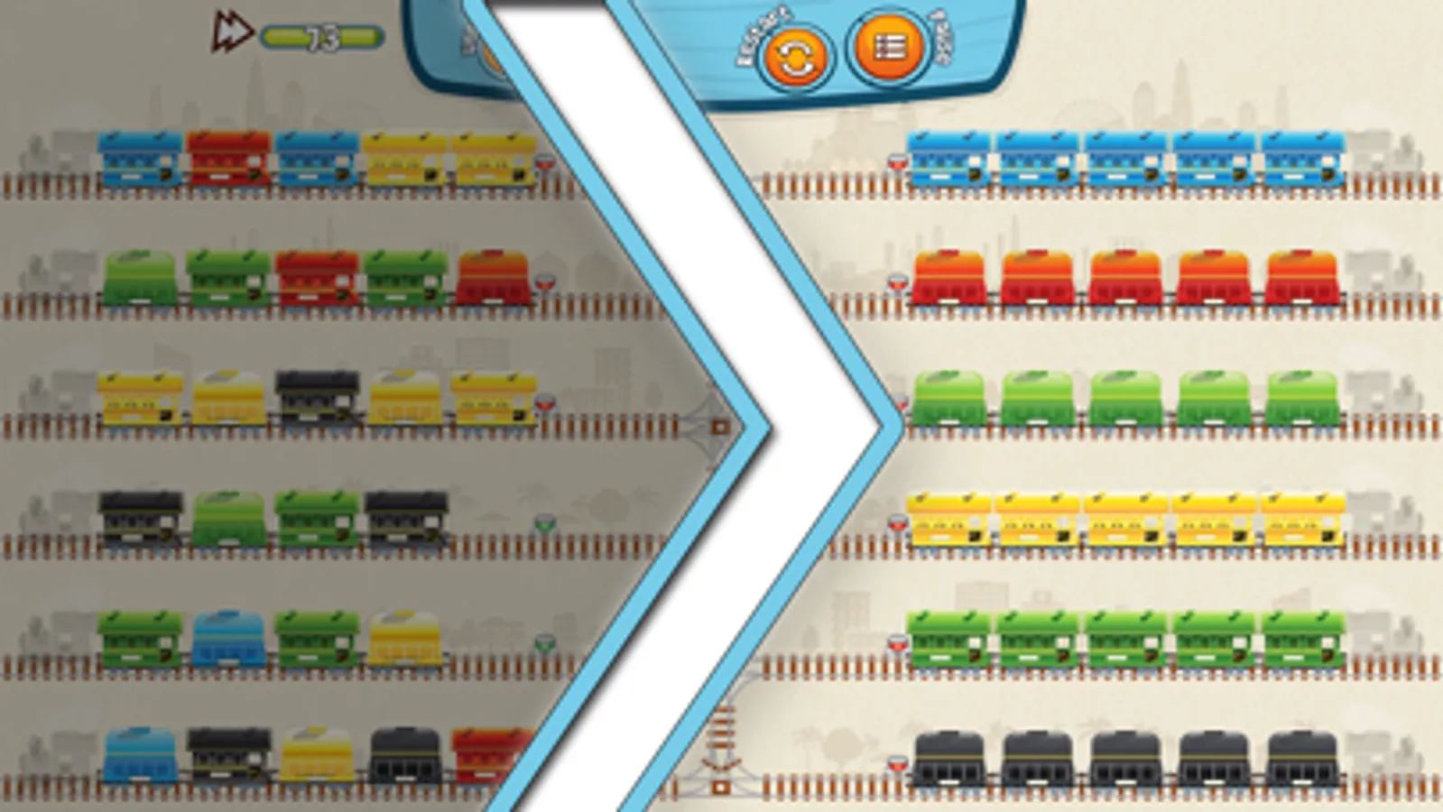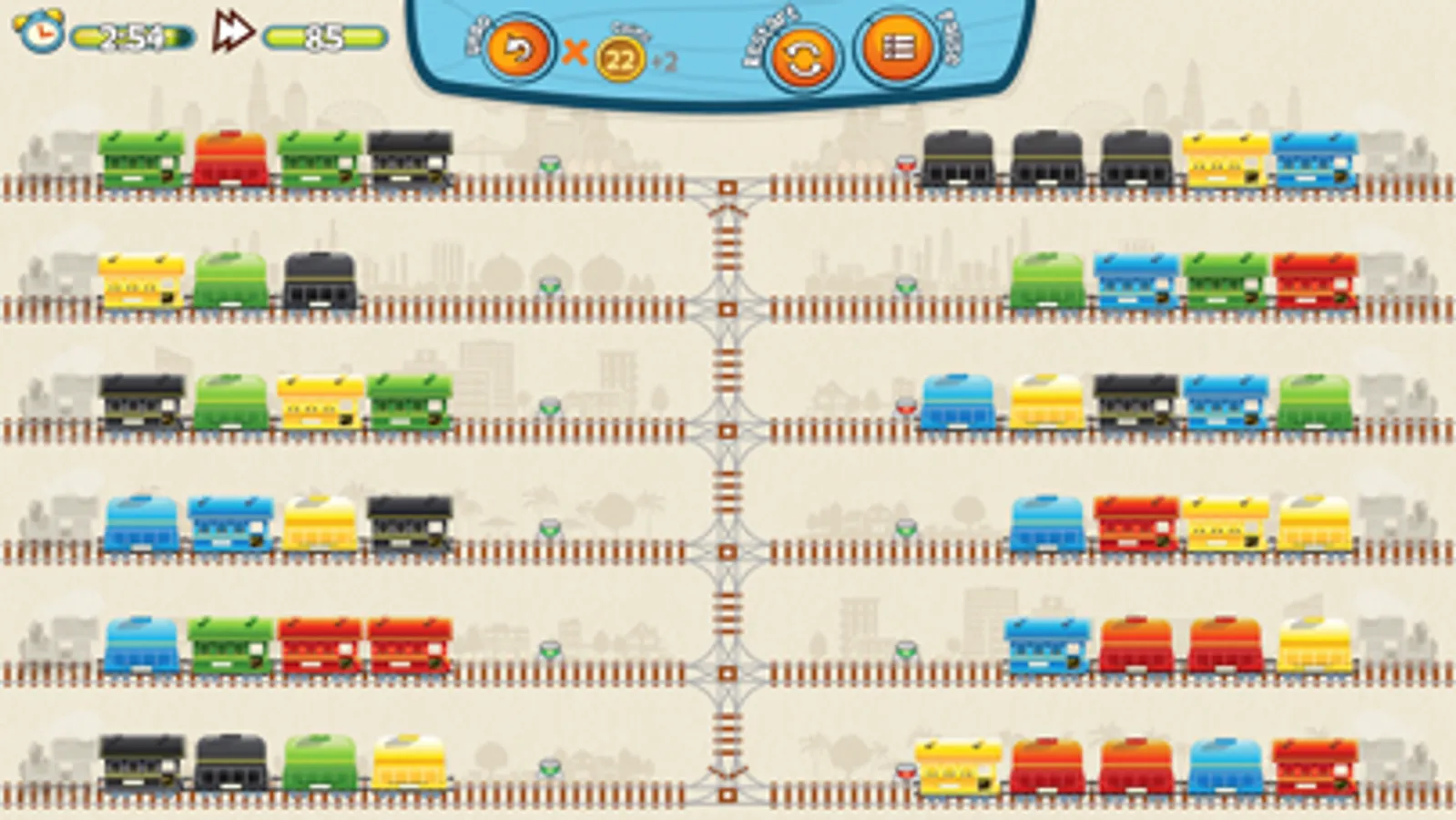 On every of 225+ carefully selected levels, you will get a shuffled combination of railroad tracks layout and railroad carriages, that you will need to arrange the carriages, matching their shape and color. Simply drag the railroad carriage from one track to another, trying to form a railroad train consisting of identical carriages of the same color. A railroad carriage can be moved either into an empty track, or behind the one of the same shape and color. If a player gets to an impasse, the strong game AI, in just few milliseconds will parse all possible solutions and will hint about the problem and suggests to roll back to the last solvable state.