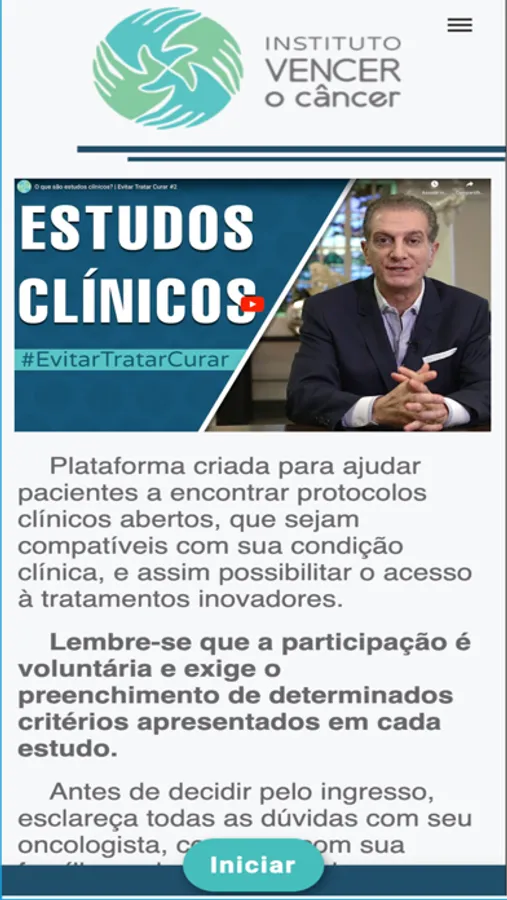 De fácil navegação, apresenta os dados obrigatórios de informação ao público como desenho do estudo, critérios de elegibilidade, abertura e encerramento e centros de pesquisa onde os estudos estão alocados. O objetivo é facilitar o acesso as informações. A fonte de referencia é o portal www.clinicaltrial.gov - um banco de dados de estudos de pesquisa clínica organizado pelo National Institutes of Health - USA.