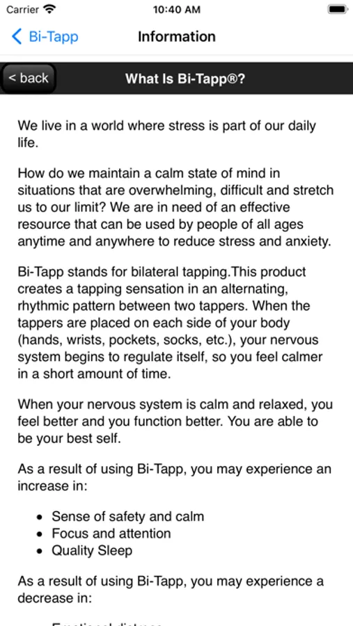 This App contains an information tab to provide additional information on how to use this product. Note: Bi-Tapp is not meant to replace mental health therapy or medical treatment. Individual results may vary.