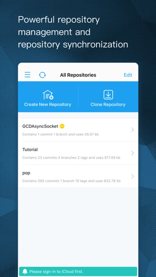 - iCloud repository syncing; no need to worry about data loss, because all repositories are backed up on the cloud!