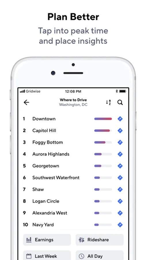 Tap into Where to Drive and When to Drive so you can focus on the most profitable gigs during peak times and in the busiest neighborhoods.