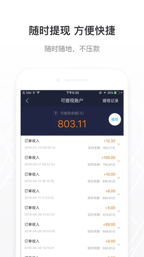 账单清晰 提现更简单:账单流水一目了然,支持随时提现