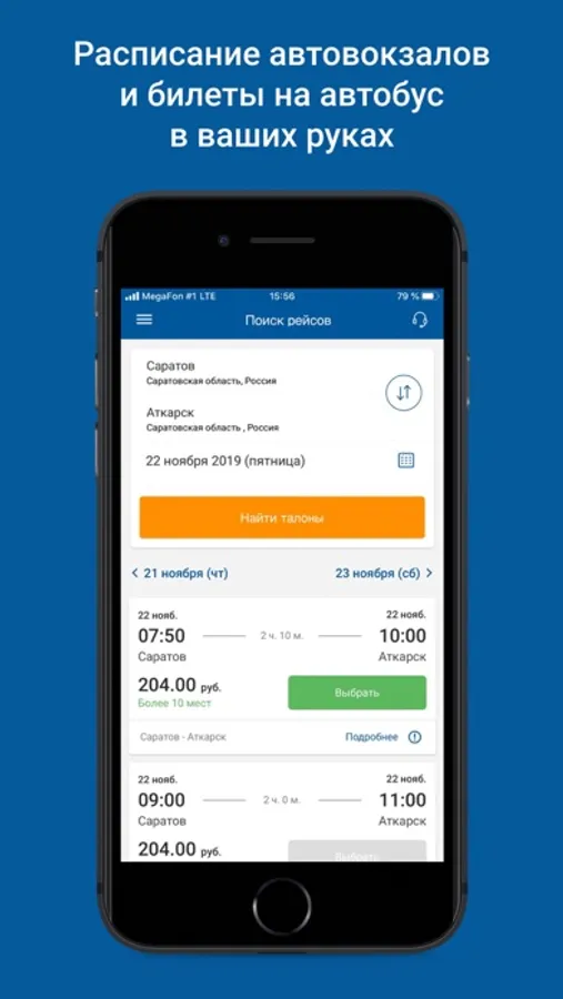 - выбор номера места в автобусе (на некоторых рейсах недоступно)