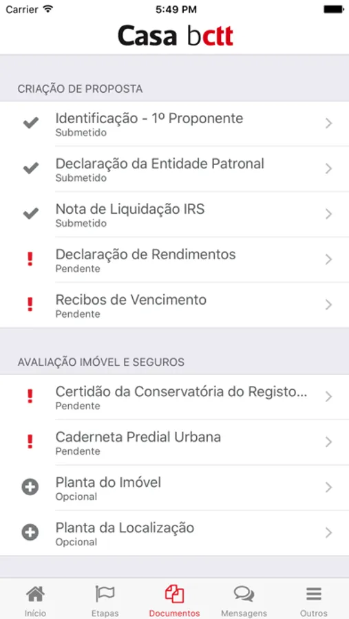 Mobile app for clients with mortgage proposal submitted to Banco CTT. The app is simple, functional and allows to accelerate the buying process due to its functionalities: tracks and organizes the several phases of the process, sends alters of missing documentation, gives notifications and checks the status of the requests.