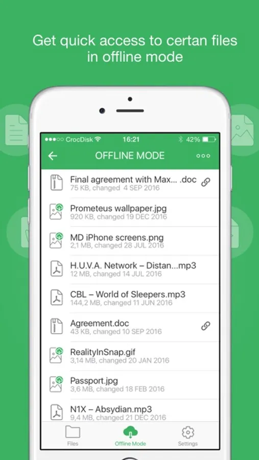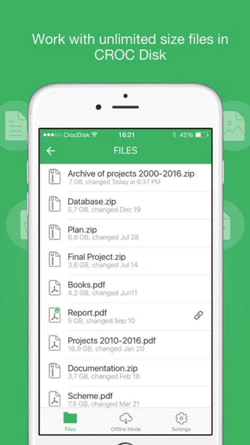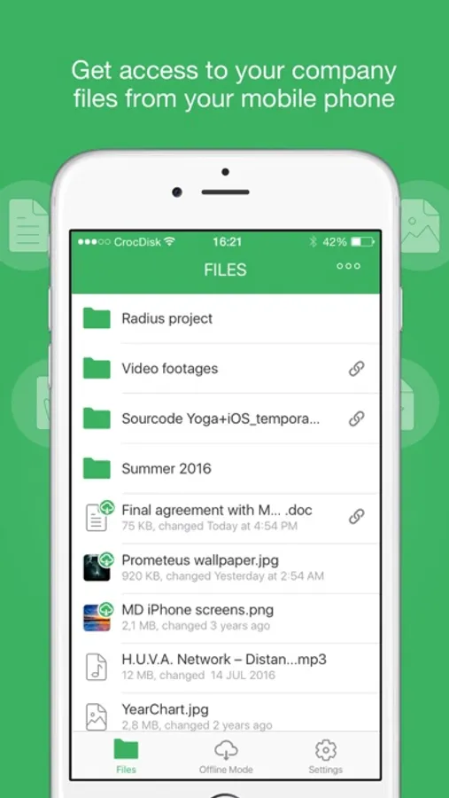 You can store your files in the corporate cloud and use the service on any device. Exchange files within your company and be sure that they are secured. CROC Disk supports the files versioning, which enables users to restore a document earlier version at any time. Even if the Internet connection lacks CROC Disk will ensure your access to the files stored on the local disk so that you can manage them offline.