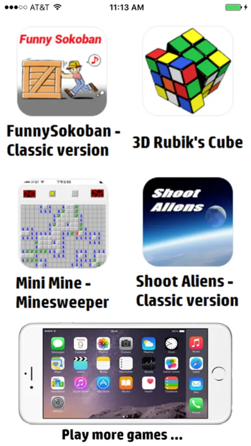 This app includes four kind of classic crush games which are Funny Sokoban, Funny 3D Rubik's Cube, Mini Mine - Minesweeper Classic version and Shoot Aliens - Classic version.