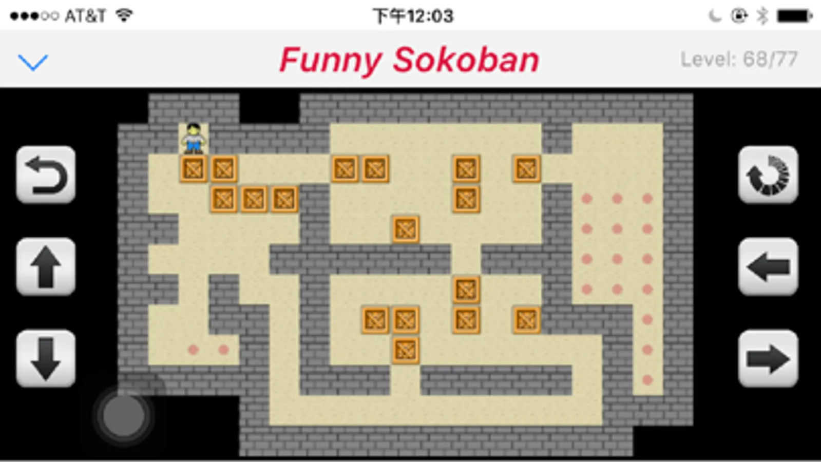 Funny Sokoban is played on a board of squares, where each square is a floor or a wall. Some floor squares contain boxes, and some floor squares are marked as storage locations. The player is confined to the board, and may move horizontally or vertically onto empty squares (never through walls or boxes). The player can also move into a box, which pushes it into the square beyond. Boxes may not be pushed into other boxes or walls, and they cannot be pulled. The puzzle is solved when all boxes are at storage locations.
