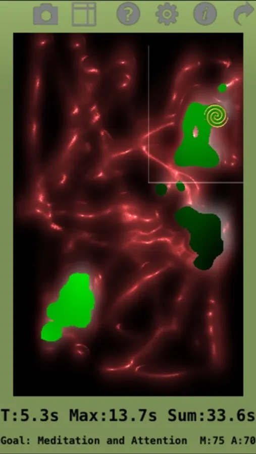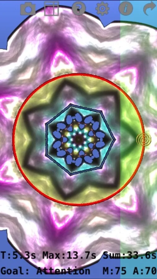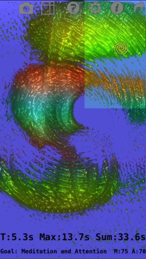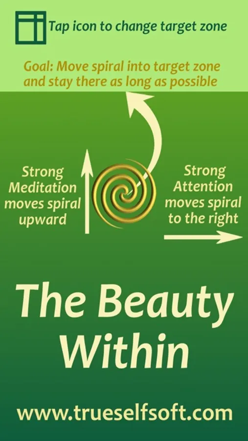 "The Beauty Within" comes with seven different themes. For each theme you can set your training goal: Meditation, Attention, or both at the same time. The Meditation and Attention values are used to move a spiral. By increasing your Meditation and/or Attention you can move the spiral into the target zone. “The Beauty Within” will then measure the time you manage to stay in the zone.