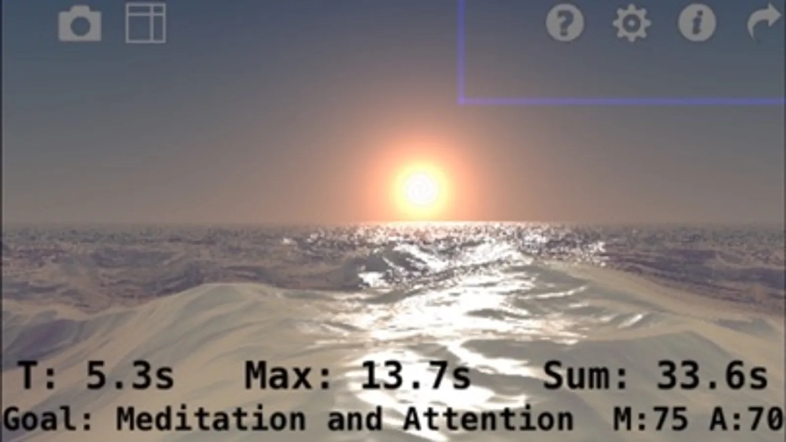 Create magnificent Mandalas, calm the waves of an ocean and let the sun rise, or let your meditation and attention values create a spoor that transforms into various animations as soon as you reach the target zone.