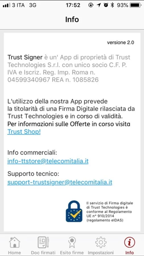 La App utilizza il formato europeo di firma elettronica qualificata, certificata eIDAS (Regolamento UE n. 910/2016). La firma apposta con Trust Signer App è riconosciuta in tutta Europa.