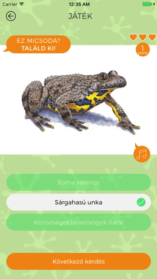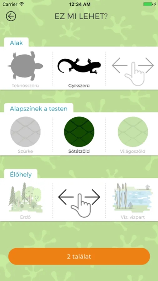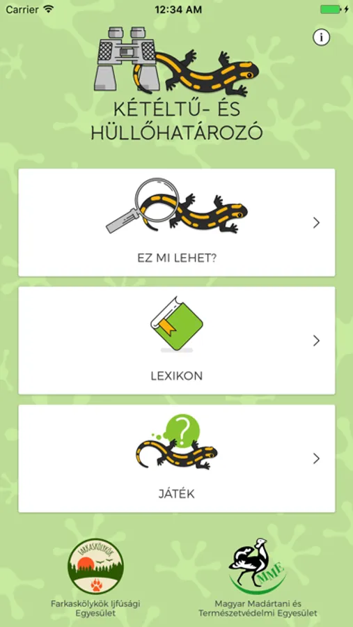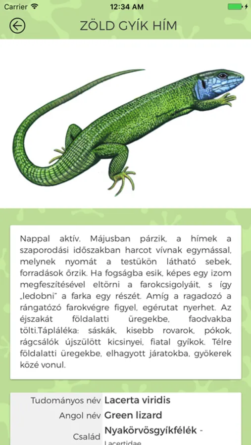 • Lexikon: Ha nem határozni szeretnél, csak ismerkedni a kétéltűekkel és hüllőkkel, akkor a lexikonban megtalálod az alkalmazásban szereplő fajok leírását, illusztrációját és hangját.