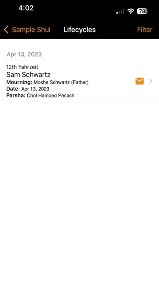 - Lifecycle Events: Quickly look up members birthdays, anniversaries, yahrzeits and much more with this app.