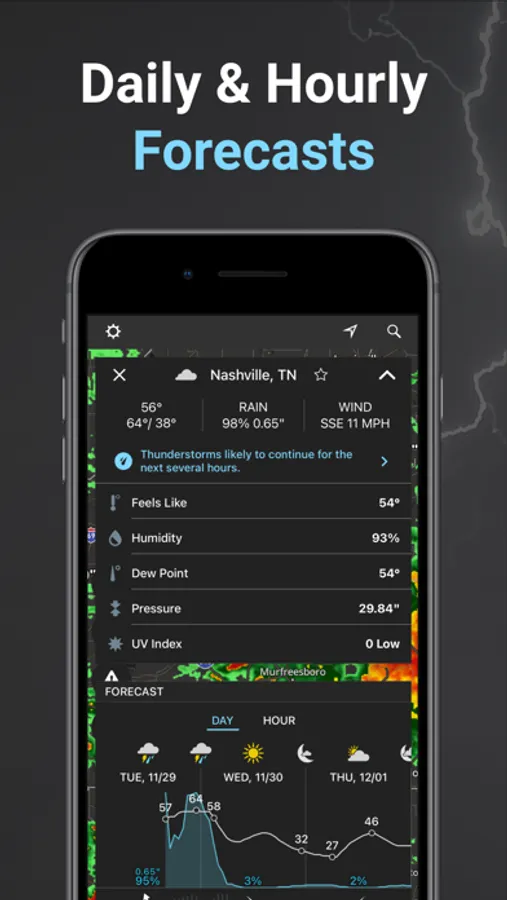 - Customize your radar map with detailed data overlays, such as wind speed and temperature.