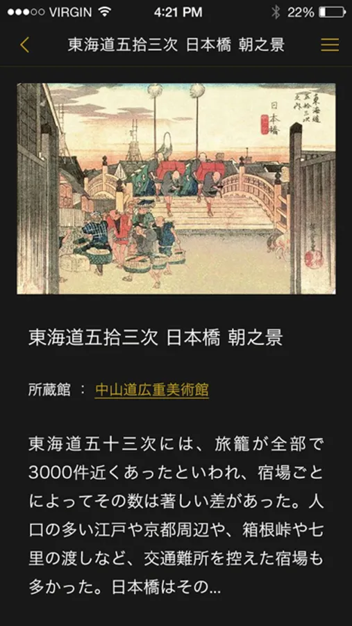 While this app was developed so that users can experience Japan’s remarkable ukiyoe, don't forget that seeing the real thing is the best way to delve into their depths. On the ukiyoe information screens one finds a link to the homepage of the museum at which the piece is held. If you like it, while not plan a trip to see it for yourself?