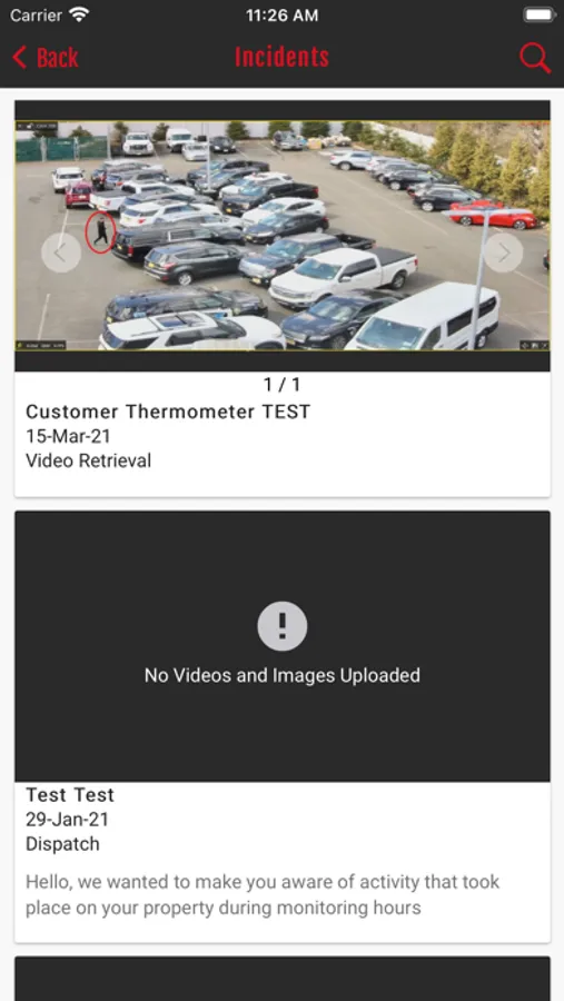 + A list view of all uploaded Incidents along with their tags, description, media and time stamp.