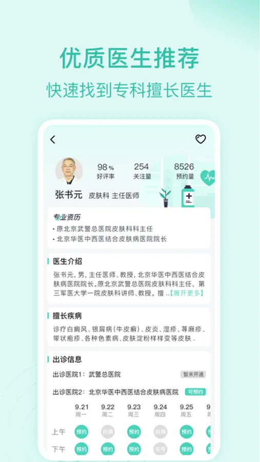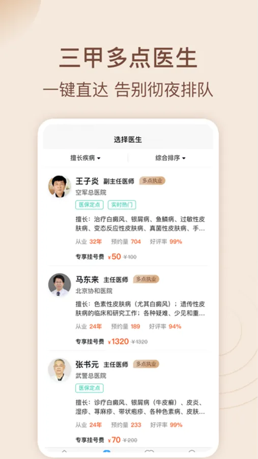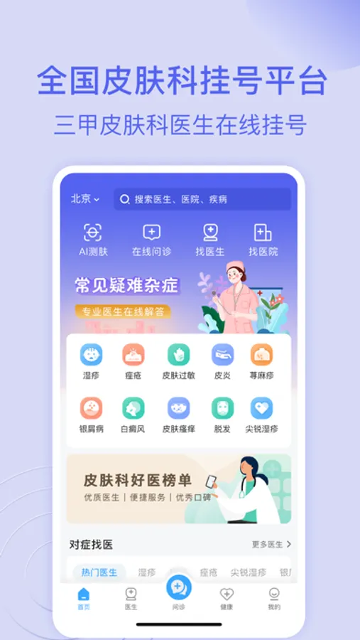 皮肤科挂号网,是全国专业全面的皮肤病就医挂号平台,揽括全国三甲医院及专科医院优质专家医生。APP提供预约挂号、医院医生评分、疾病咨询、皮肤肤质自测工具等多项服务,花最少的时间,选好皮肤病专家,专病专治。