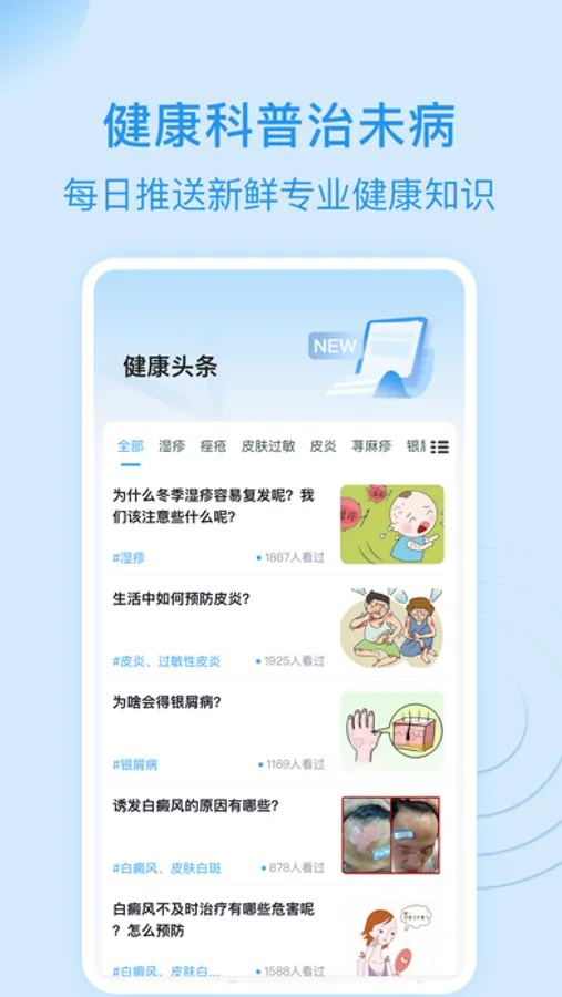 白癜风,银屑病(牛皮癣),皮炎,湿疹,儿童湿疹,荨麻疹,丘疹样荨麻疹,痤疮,带状疱疹(疱疹),各种色素病,鱼鳞病,皮肤淀粉样变,斑秃,烧烫伤疤痕,陈旧性疤痕,浅表性疤痕,疤痕疙瘩,传染性软疣,玫瑰糠疹,手足癣,红斑狼疮,扁平苔藓,血管炎,病毒性皮肤病,红斑丘疹,鳞屑性皮肤病,感染性皮肤病,过敏性皮肤病,真菌性皮肤病,性传播疾病等。
