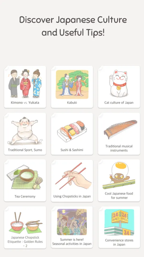 The Eggbun app also has a culture cards section introducing different aspects of Japanese ideas and customs with fun illustrations. Learn useful aspects of the fascinating Japanese culture that dates back thousands of years while you study the language.