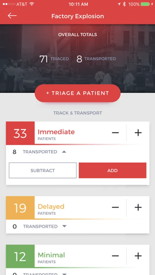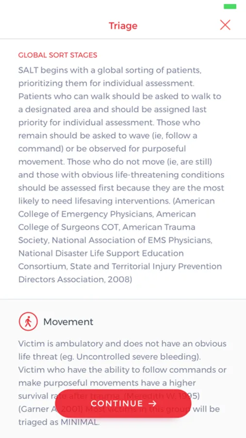 The SALT Triage app is designed to assist an emergency provider in performing triage and keeping count of victims from a Mass Casualty Incident (MCI). The app allows the creation of a disaster event, provides information on critical actions and initial steps to perform triage and life saving interventions. The app will keep track of the number of victims on scene and the number that have been transported in each triage category.