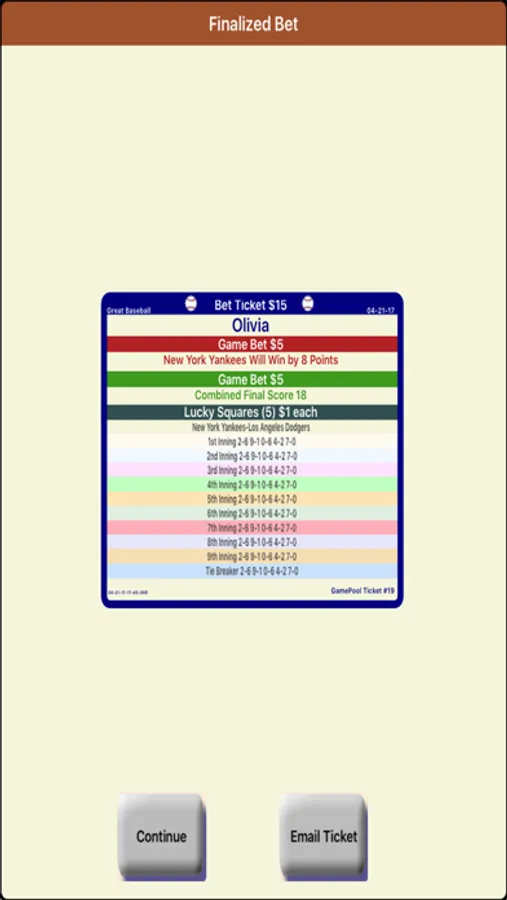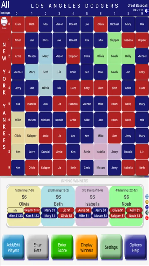 • Bets can be entered by the host directly or submitted remotely by players by using the Baseball GameBet app